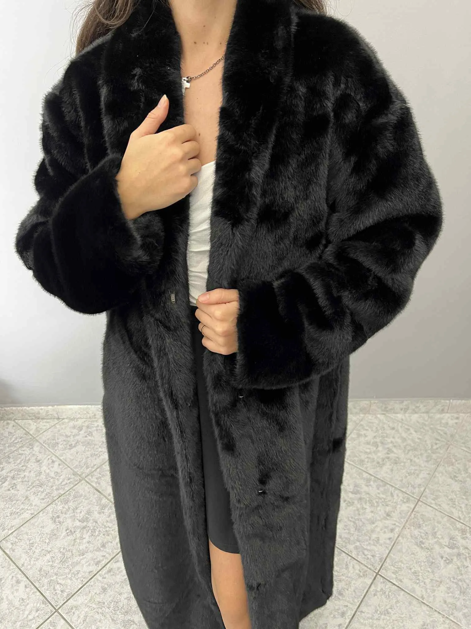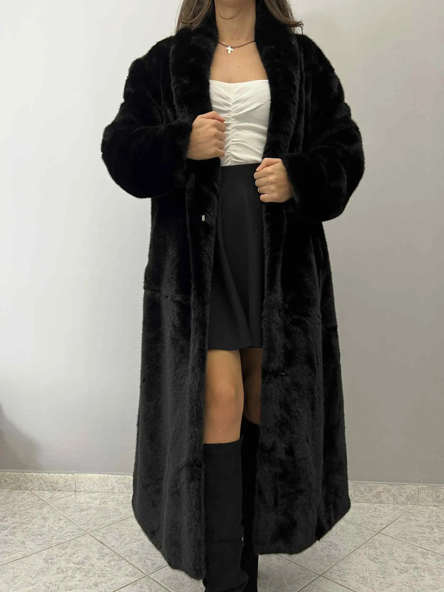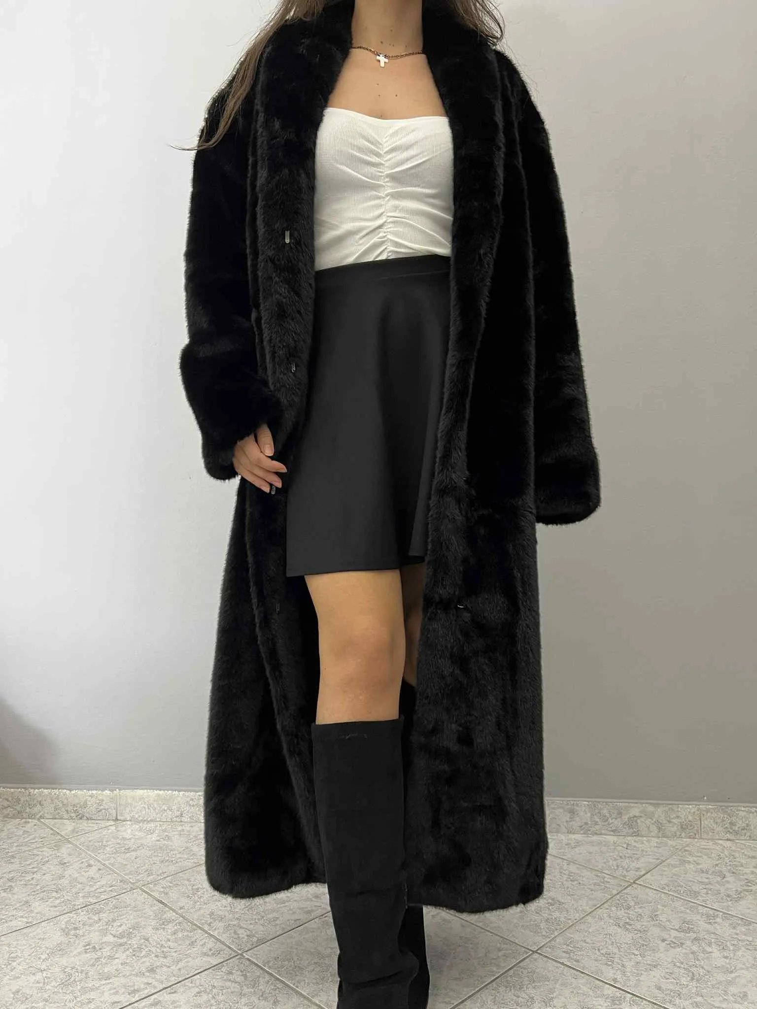 Μακριά γυναικεία γούνα με γιακά σε μαύρο χρώμα, που συνδυάζει πολυτέλεια, άνεση και κομψότητα, Κατασκευασμένη από παχιά, υψηλής ποιότητας συνθετική γούνα, προσφέρει εξαιρετική ζεστασιά ακόμη και στις πιο κρύες μέρες του χειμώνα. Διαθέτει κουμπιά στο μπροστινό μέρος για εύκολη εφαρμογή και εσωτερική φόδρα που χαρίζει άνεση και σταθερή εφαρμογή.