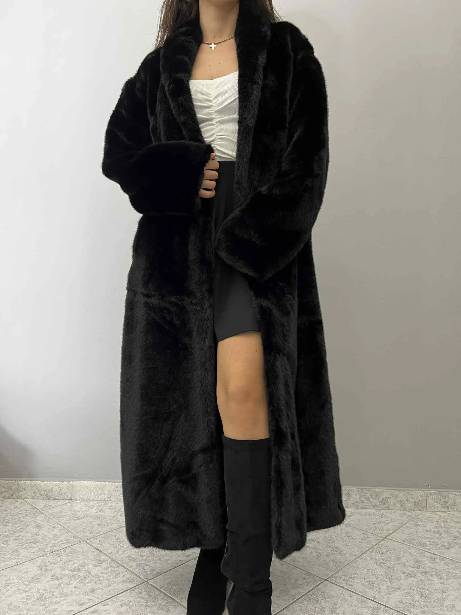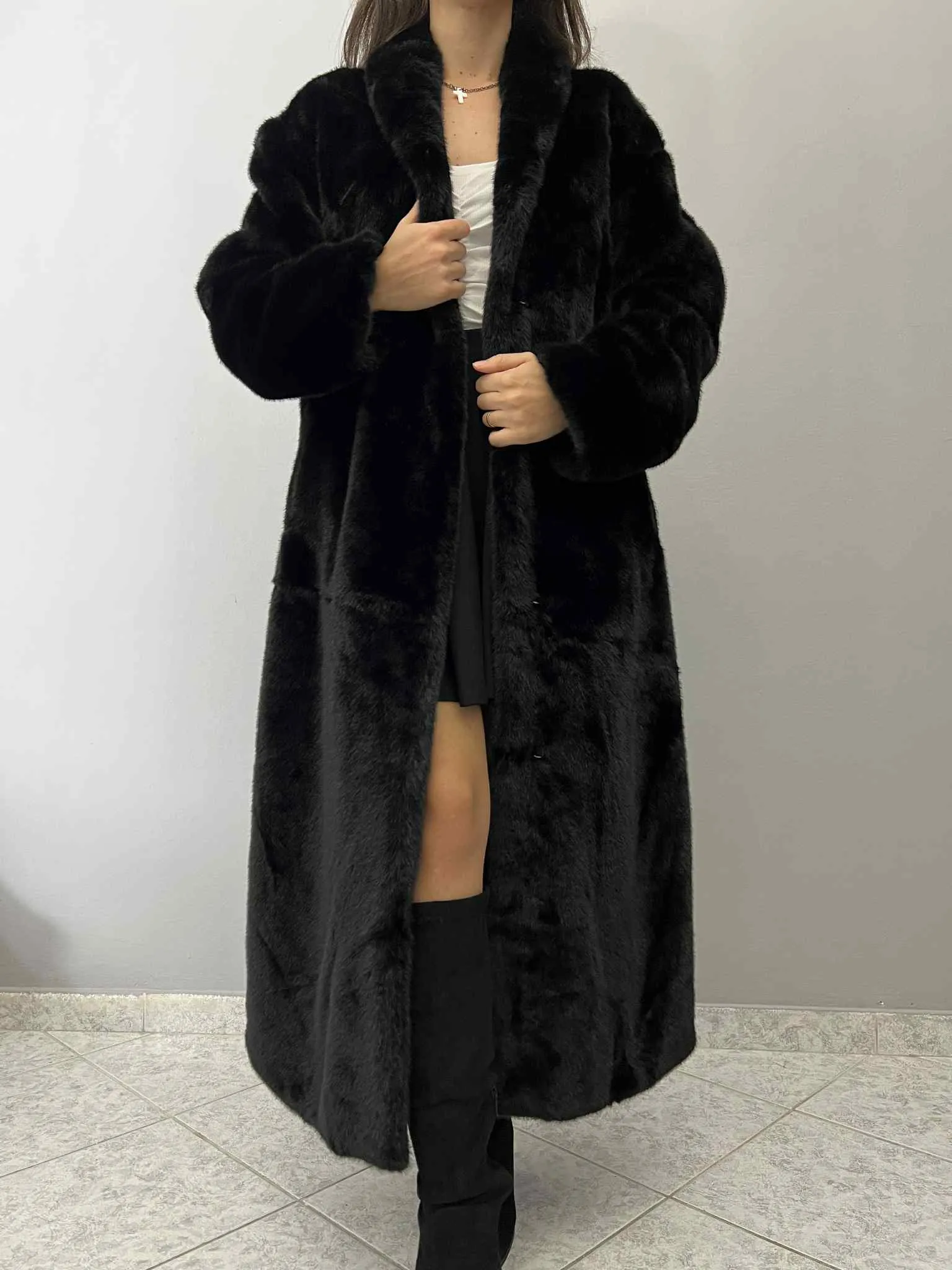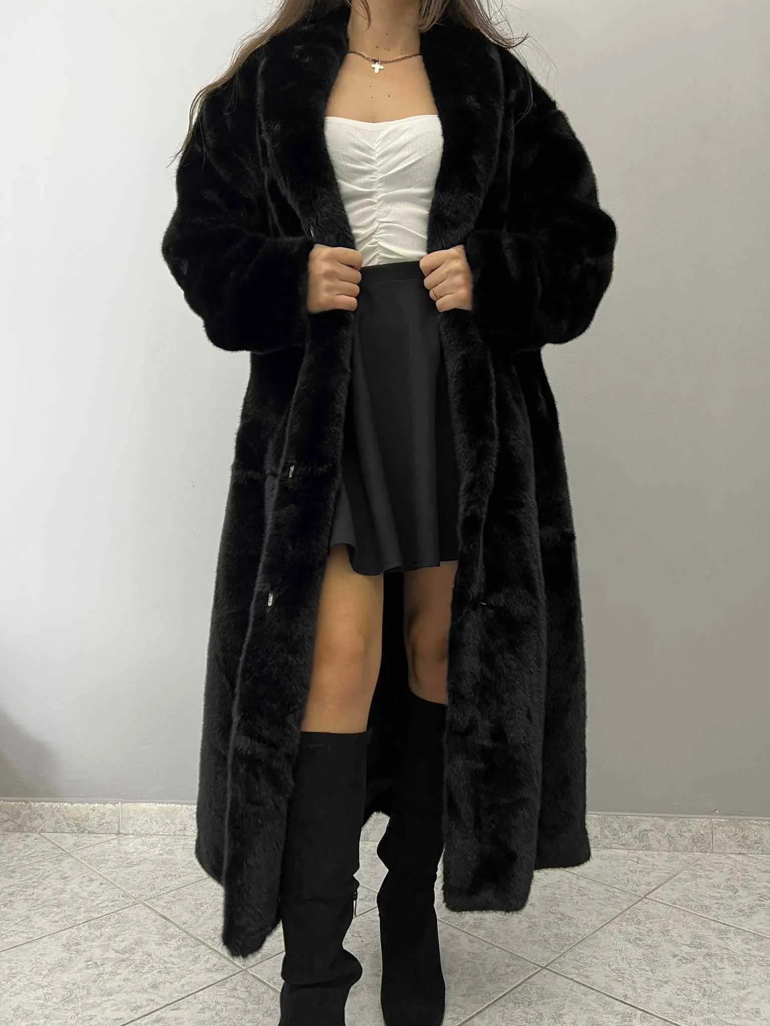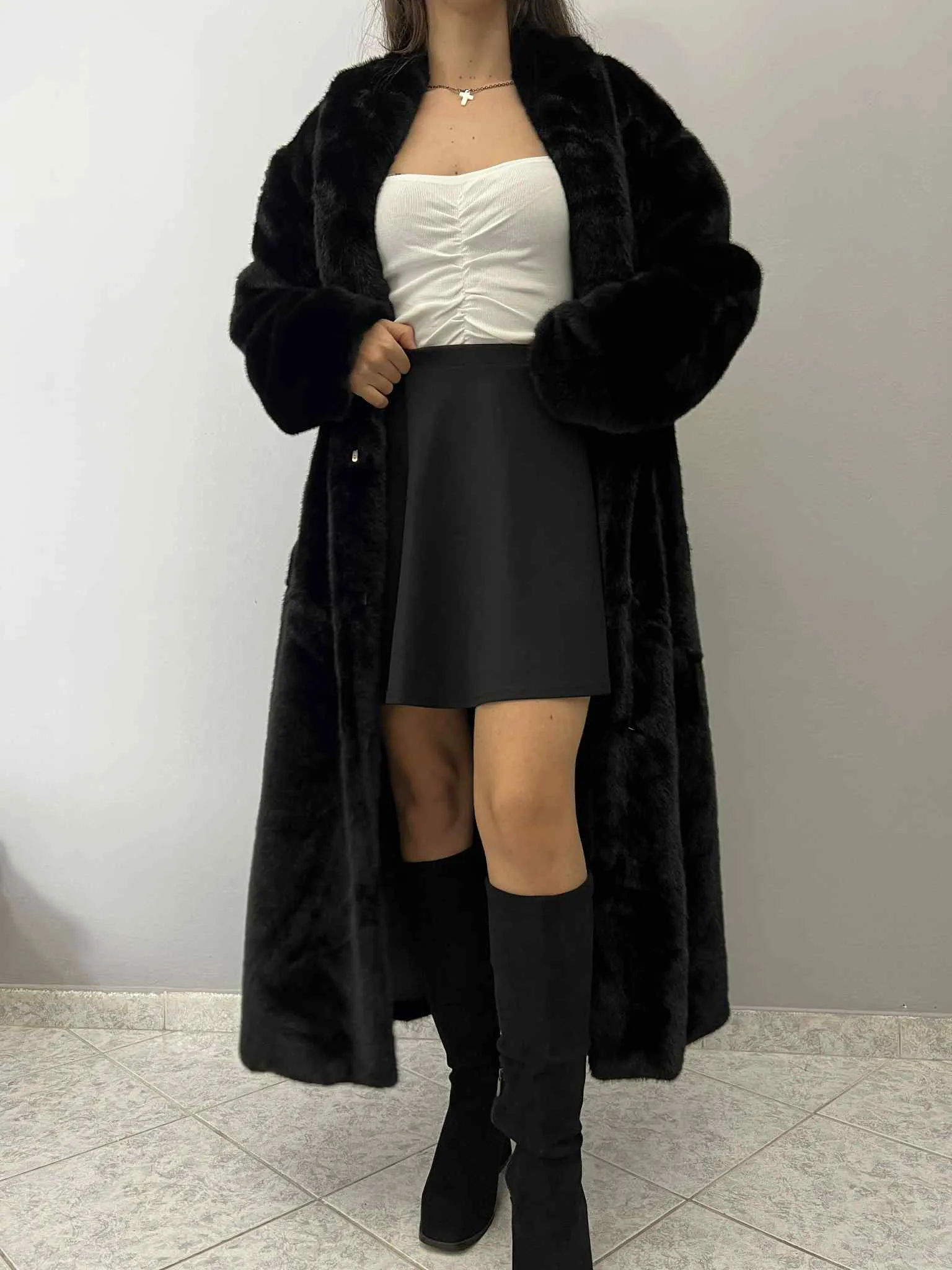 Μακριά γυναικεία γούνα με γιακά σε μαύρο χρώμα, που συνδυάζει πολυτέλεια, άνεση και κομψότητα, Κατασκευασμένη από παχιά, υψηλής ποιότητας συνθετική γούνα, προσφέρει εξαιρετική ζεστασιά ακόμη και στις πιο κρύες μέρες του χειμώνα. Διαθέτει κουμπιά στο μπροστινό μέρος για εύκολη εφαρμογή και εσωτερική φόδρα που χαρίζει άνεση και σταθερή εφαρμογή.